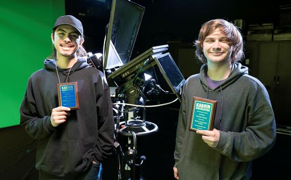 Cole Wert (left) and Evan Sinclair took home honors from this year's Kansas Association of Broadcasters Student Production awards. (Joe Wescott)